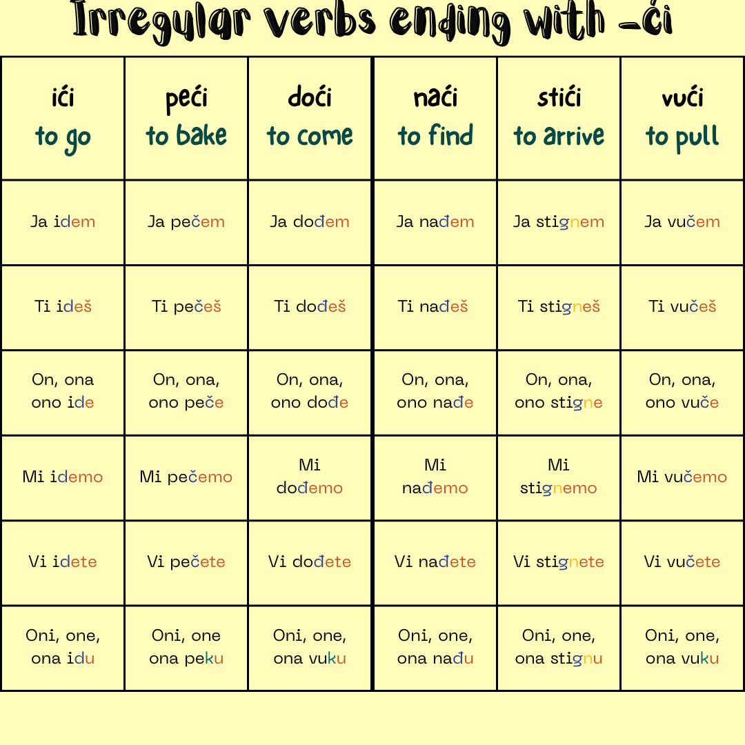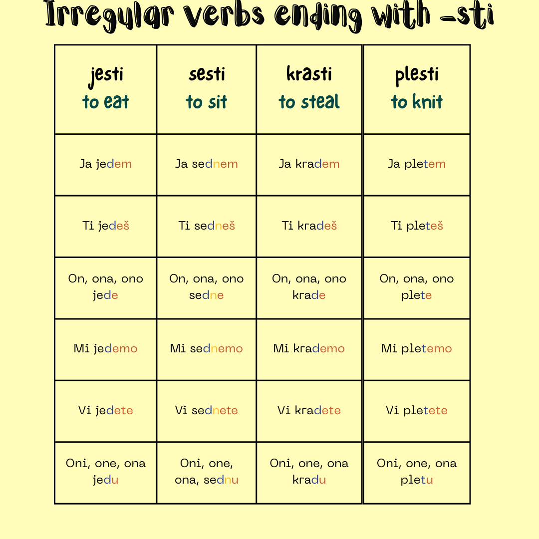 Irregular verbs is where it might get tricky, we can not lie. There is no other way to remember them than by learning them by heart. You will have to memorize the base, and add the endings: –em, –eš, –e, –emo, ete, –u. We have marked the letter and sound changes from infinitive to present form conjugation for your convenience. Take a look at the most frequently used irregular verb conjugation: